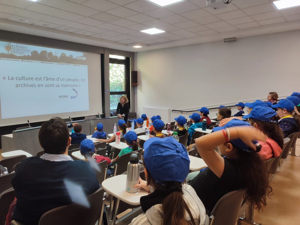 S’agissant des enfants, normalement, la loi interdit l’accès aux mineurs. Pour ce qui est des papiers, ils sont soumis à un contrôle rigoureux. Les Petits Ambassadeurs du Patrimoine ont obtenu une dérogation et ont traversé le même parcours que chacun des documents qui pénètre les lieux. Avec Douglas, ils sont entrés par le quai de livraison. Ils sont passés au tri et au nettoyage avant de traverser les 21km de rayonnage des magasins. Ils ont vu une girafe et un pied d’éléphant, si, si ! Ils ont aussi travaillé sur une carte de Cassini, un cadastre napoléonien, un registre d’état civil, un recensement de population, une délibération…parce que Marie-Sophie leur avait préparé des ateliers pédagogiques autour de la commune.